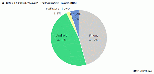 端末OSについては、「iPhone」45.7%、「Android」47.0%とほぼ拮抗。