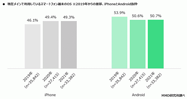 まずOSについては、「iPhone」45.7%、「Android」47.0%、「その他のスマートフォン」2.2%となり、ほぼ拮抗している。「わからない」が5.0%あるため、明確にAndroidが上回ったとは言えない状態だ。なお前年2020年の類似調査からはほぼ数字の変動はないが、2019年調査からは「iPhone」が3.2ポイント増、「Android」が3.2ポイント減となっている。