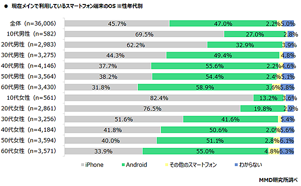 引き続き10~20代はiPhoneを支持、Android利用は60代男性がトップ