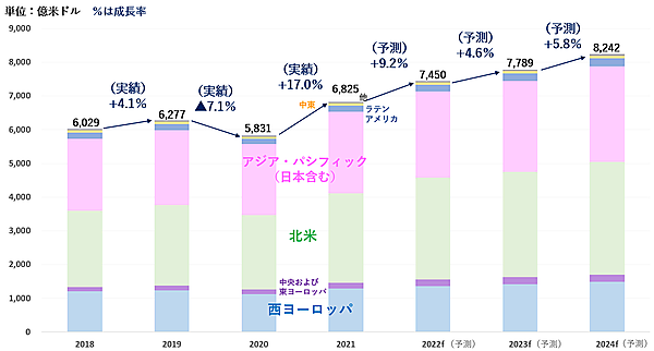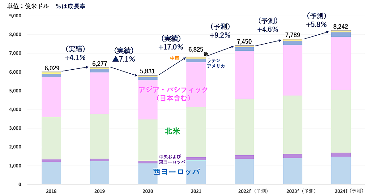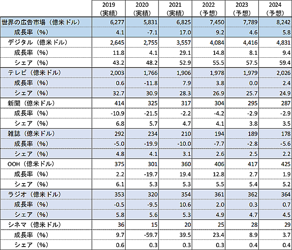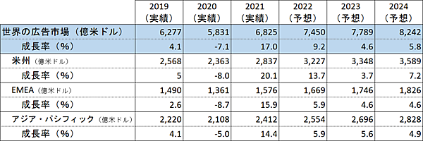電通グループは、世界59市場から収集したデータに基づく「世界の広告費成長率予測」を1月27日に発表した。コロナ禍で20年の成長率はマイナス7.1%だったが、21年は7月発表予測の10.4%を上回る17.0%と大幅に回復し、19年の4.1%を上回る6825億ドル(78兆8500億円)だった。22年は9.2%成長の7450億米ドル(86兆2700億円)と予測した。
