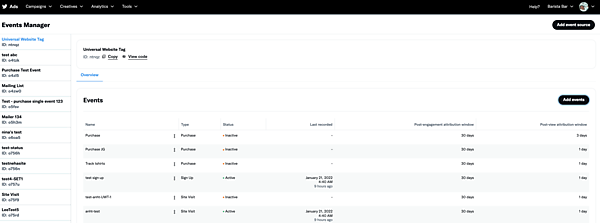 イベントマネージャーは、Twitterウェブサイトタグと関連するウェブベースのコンバージョンイベントを一元管理する画面になる。Twitterウェブサイトタグの設置方法やコンバージョンイベントの設定方法の分かりやすいガイダンスとインターフェースになり、コンバージョンイベントのリアルタイムな取得状況がわかるダッシュボード機能がある。