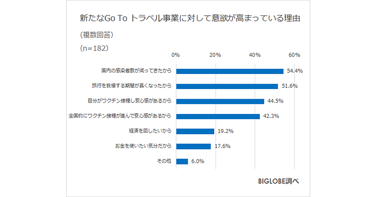 新たなGo Toトラベル事業に対する意欲が「高まっている」と回答した182人に、その理由を聞くと、「国内の感染者数が減ってきたから」54.4%、「旅行を我慢する期間が長くなったから」51.6%、「自分がワクチンを接種し安心感があるから」44.5%、「全国的にワクチン接種が進んで安心感があるから」42.3%が上位だった。しかしこの前提が変わってきており、再開時期については不透明な状況が当分続くと考えられる。
