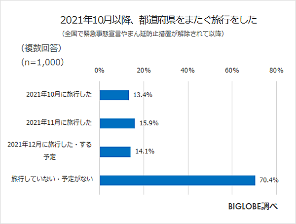 「2021年10月に緊急事態宣言・まん延防止措置が解除されて以降、都道府県をまたぐ旅行をしたか」を聞くと、「2021年10月に旅行した」13.4%、「2021年11月に旅行した」15.9%、「2021年12月に旅行した・する予定」14.1%と約3割がすでに旅行済み、または年末の旅行を予定していた。複数回の旅行者もいるようだ。