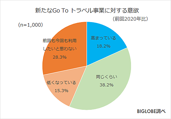 2022年1月末時点ではオミクロン株の流行により、実施が延期されているが、「前回(2020年)のGo Toトラベルキャンペーン実施当時と比べて、新たなGo Toトラベル事業に対する意欲に変化があるか」を聞くと、「前回より高まっている」18.2%、「前回と同じくらい」38.2%とした人が多かった。2022年のGo Toトラベル事業は、割引率(35%→30%)や割引上限(日帰り7000円→3000円など)が縮小されているが、それでも活用したい人は多いようだ。