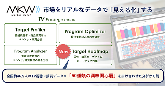 カルチュア・コンビニエンス・クラブ(CCC)グループでマーケティングソリューション事業のCCCマーケティングは、テレビ局、広告会社・広告主向けのテレビCM出稿分析ツールとして同社が展開する「Market Watch Target Heatmap(MKW TH)」に「興味関心セグメント」を1月31日に追加した、と同日発表した。エンタメ、教育、料理、旅行など約60種類の興味関心層となる。