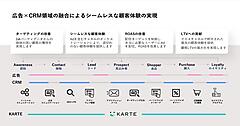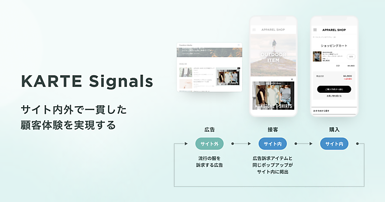 KARTE Signalは、ファーストパーティデータをサイト外のオンライン広告の体験向上に生かすことが可能になる。自社サイトの行動データと、自社CRM(顧客関係管理)の購買データ、実店舗のPOS(販売時点情報管理)データなどを統合し、顧客とのコミュニケーションに活用できる。サイトのポップアップ接客やメール、SNSを通してCXを高めるKARTEの技術と知見をサイト外に広げる。