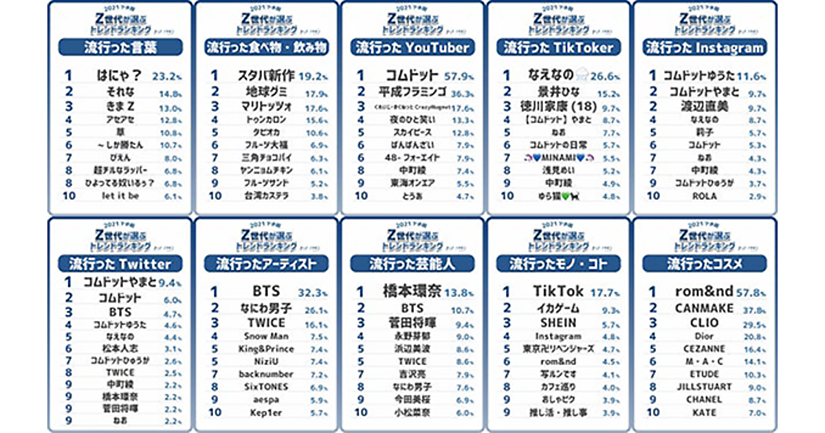 N.D.Promotionは、「Z世代が選ぶ2021年下半期トレンドランキング」を発表した。同社が運営するシンクタンク組織「Z総研」のコミュニティに所属するZ世代の女性メンバー870人から回答を得ている。「Z世代」は一般的に、1995~2003年生まれ(現在17歳~25歳)の年代を指す。