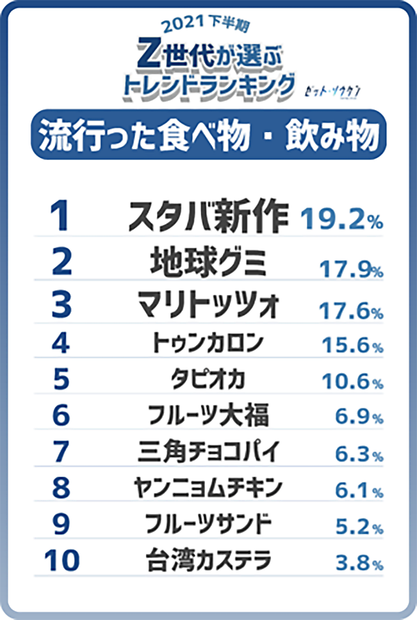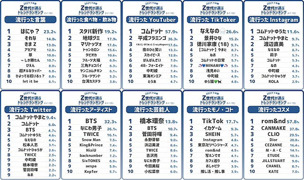 この調査では、Z総研メンバーに流行った言葉、食べ物、YouTuber、TikToker、Instagramユーザー、Twitterユーザー、アーティスト、芸能人などを聞いている。