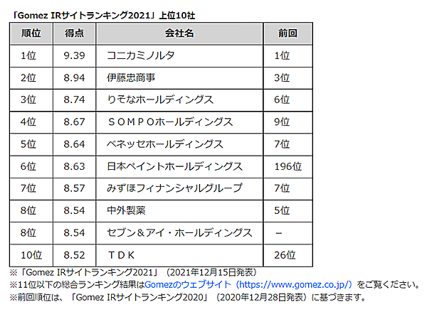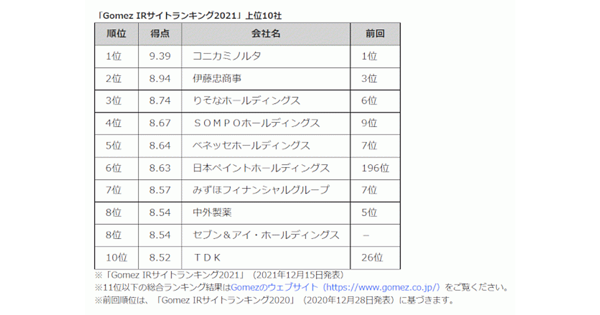 その結果「IRサイトランキング2021」1位は9.39点で「コニカミノルタ」だった。コニカミノルタは4年連続の総合1位となっている。従来より使いやすさで定評を得ていたが、文字サイズをより大きく改良したり、Cookieポリシーを掲載したり、さらに改善を加えたことも評価された。「スキルマトリックス」「TCFDへの賛同」といった社会的関心度の高い新規コンテンツも採り入れている。