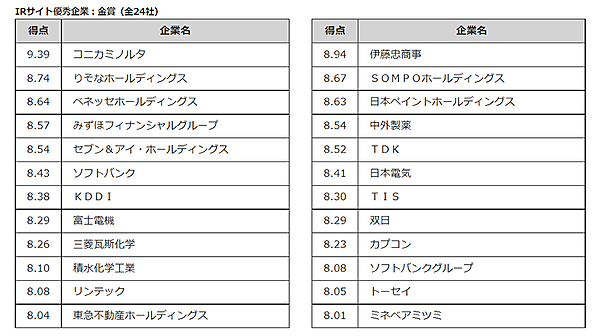 - 【評価方法】241の調査項目からなるスコアカードに基づいて、アナリストが実際にウェブサイトを使用しながら調査を行い、総合ランキングを決定。総合得点8.00以上を「金賞」、7.00以上を「銀賞」、6.00以上を「銅賞」として、優秀企業を選出(305社が該当)