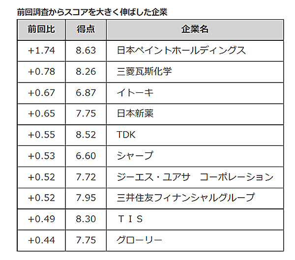 なおサイトリニューアル、コンテンツ拡充などで特に大きくスコアを伸ばした企業としては、前回から1.74ポイント増の8.63点をマークした「日本ペイントホールディングス」が1位だった。
