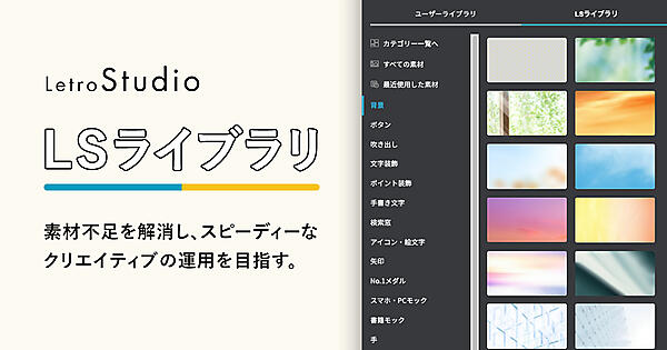 LSライブラリによって素材の収集・作成の手間を省き、制作から改善までのスムーズな広告運用につなげられ、広告成果の向上が期待されるという。背景素材、吹き出しなど広告クリエーティブの素材不足を解消し、利用企業の商品に特化したオリジナル素材の提供も可能。LetroStudioのユーザーは月額5万円からメニュー追加できる。