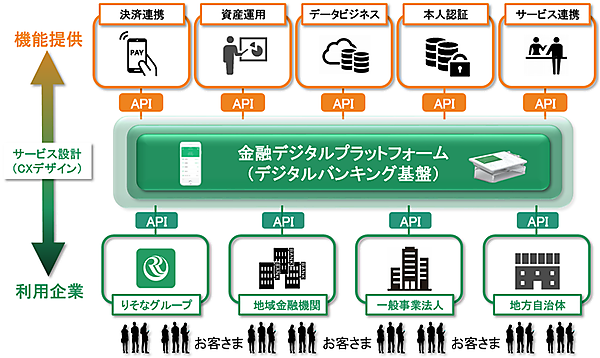4月1日設立の新会社「FinBASE(フィンベース)」の出資比率は、りそなHD80%、NTTデータ10%、日本IBM10%。3社で共創する「デジタルバンキング基盤」で、金融機関と異業種の外部企業をつなぐ金融デジタルプラットフォームに参加する企業の開拓と情報収集、市場調査を行う。多種多様な参加者を通じてオープン・イノベーションを実現する。