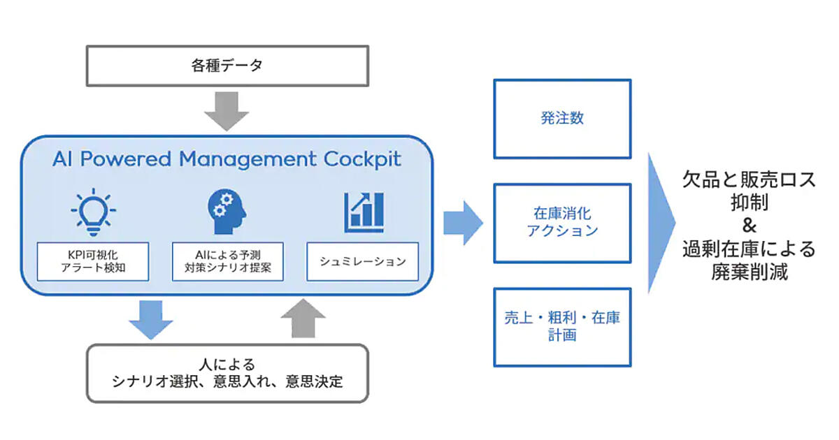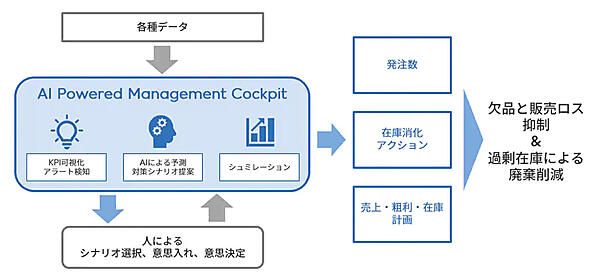 経営目標や管理指標に対する進捗(しんちょく)状況を一覧表示。未達見通しの場合はアラートを出して、達成に向けた対応策をAIが複数提示し、対応策を講じた場合の効果もシミュレーションされる。1年強にわたる試験運用の結果、欠品による販売ロス(売り逃し)を2019年比で約65%削減し、廃棄ロスの約10%削減を確認した。AIと人による経験則を融合し、検証結果も反映してカスタマイズした独自システムの本格運用を開始した。