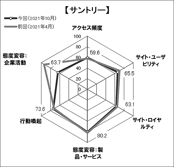 サントリーは個別指標で「態度変容:製品・サービス」「行動喚起」が引き続き高い。一方で「態度変容:企業活動」が前回93.7ポイントから30.0ポイント減の63.7ポイントとなった。