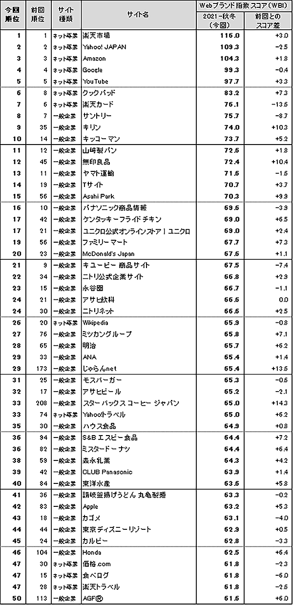 日経BPコンサルティングは、「Webブランド調査2021-秋冬」の結果を発表した。2021年10月中旬に調査を行い、38,271人が回答している。