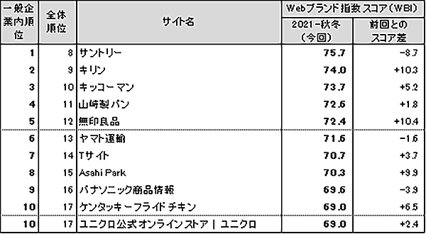 トップ7まではネット専業サイトが占めるが、8位からは「サントリー」など一般企業サイトがランクイン。上位トップ3は、8位「サントリー」、9位「キリン」、10位「キッコーマン」だった。このなかでは「キリン」が前回35位から、「キッコーマン」が前回14位からランクをあげている。