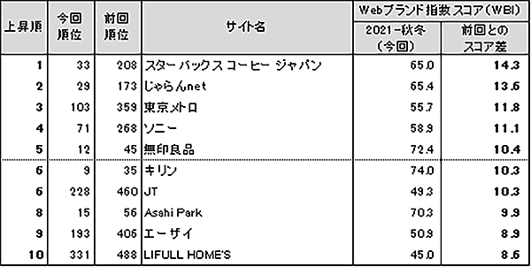 前回から今回にかけてのスコア上昇で見ると、「スターバックス コーヒー ジャパン」「じゃらんnet」「東京メトロ」がそれぞれ10ポイント以上を加算した。「スターバックス コーヒー ジャパン」は6つの個別指数すべての評価が前回を上回ったという。