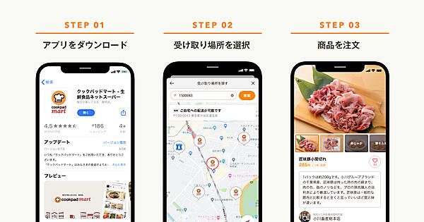 クックパッドマートは、地域の生産者や卸売市場の仲卸、商店街の専門店、飲食店や惣菜店など700店超の出店者が販売する約1万3000種類の商品を購入でき、アプリで注文した食材を1品から送料無料で受け取り専用冷蔵庫の「マートステーション」で受け取る。1配送あたり550円払えば自宅配送も提供しており、今回は期間限定の割引クーポンコードによって無料にする。自宅配送は置き配にして非接触で受け渡しが可能。
