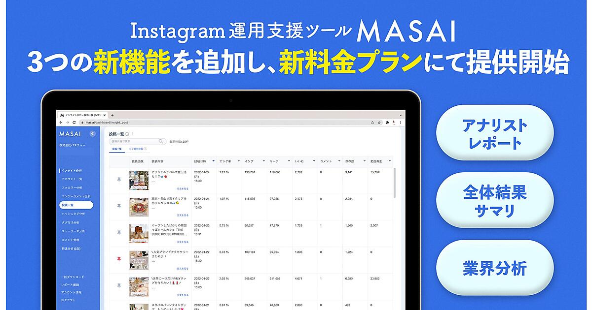 SNSマーケティング支援事業のパスチャーは、同社の「Instagram」運用支援ツール「MASAI」に新機能を2月初めから加えるとともに、新たな料金プランを始める、と2月7日発表した。新しい機能は①アナリストレポート②全体結果サマリ③業界分析--の3つ。料金プランは最低契約期間を短縮するなど、目的や利用形態に応じて導入しやすく変更する。