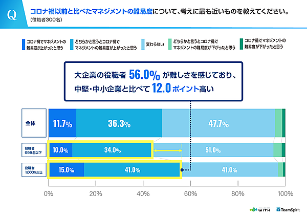 まず「コロナ禍におけるマネジメントの難易度の変化」について役職者に聞くと、「コロナ禍でマネジメントの難易度が上がったと思う」と「どちらかと言うとコロナ禍でマネジメントの難易度が上がった」の合計は、全体では48.0%だった。一方企業規模別では、社員1,000人未満では44.0%、社員1,000人以上では56%となり、やはり人員が多いほど、マネジメントの難易度が上がったようだ。
