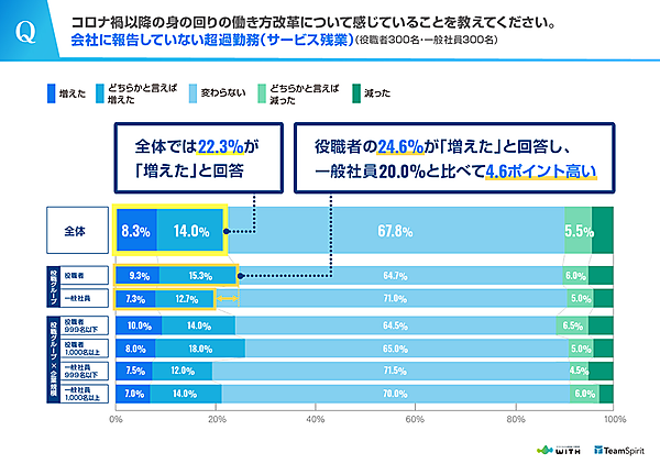 「会社に報告していない超過勤務(サービス残業)の増減」について全体に聞くと、全体では22.3%が「増えた・どちらかと言えば増えた」と回答しているが、役職者は24.6%、一般社員は20.0%と差が見られる。また企業規模で見ると、これも人員が多いほど、超過勤務が増えている。