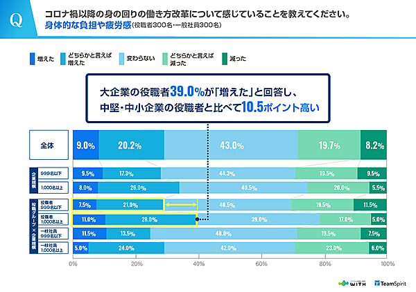 その結果として、「身体的な負担や疲労感」について、大企業の役職者ほど増えたと回答している。全体では「増えた・どちらかと言えば増えた」は29.2%だが、社員1,000人以上の役職者については、39.0%が身体的な負担や疲労感が増えたと回答している。