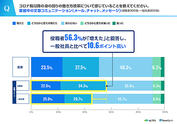 業務中の文章コミュニケーション(メール、チャット、メッセージ)、オンライン会議コミュニケーション(Web会議)の変化について聞くと、文章コミュニケーションが「増えた・どちらかと言えば増えた」という回答は全体で51.0%。役職者が56.3%と、一般社員の45.7%と比べて高い。