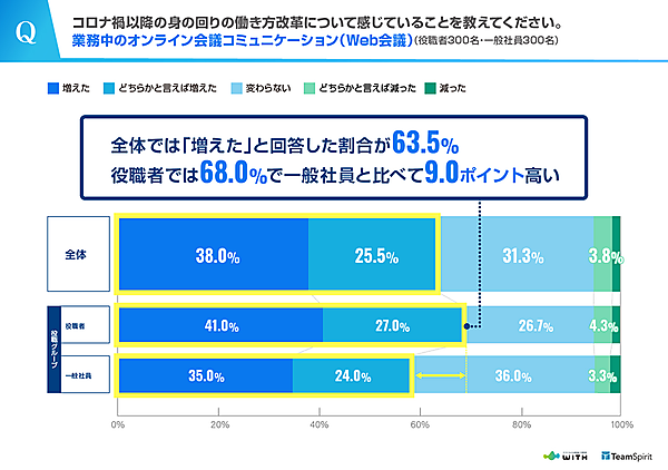 オンライン会議コミュニケーションについても「増えた・どちらかと言えば増えた」が全体63.5%に対し、役職者は68.0%とやはり高い。
