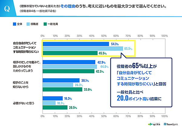 そこで、「理解が足りていない」と回答した役職者84人・一般社員112人にその理由を聞くと、全体では「自分自身が忙しくてコミュニケーションする時間が取りにくい」54.1%、「相手の忙しさを鑑みて、話しかけるのをためらってしまう」42.9%、「相手のことを知らないから」30.1%が上位だったが、役職者ほど「自分自身が忙しくてコミュニケーションする時間が取りにくい」と強く考えていた。逆に「相手のことを知らないから」「必要がないと思う」は一般社員より低い。このことから役職者はコミュニケーション時間を作り出すことが課題だと言えるだろう。