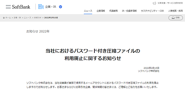 マルウエアの感染経路に利用されるなど、世界的に悪意のある攻撃が多く確認され、ソフトバンクでもこうしたメールの受信があった。受信者側の手間が増えることもあり、最近は国内でパスワード付き圧縮ファイルの利用を廃止する動きが広がり、内閣府など国の機関でも利用を取りやめた。今後も廃止を検討する企業が増えるとみられる。