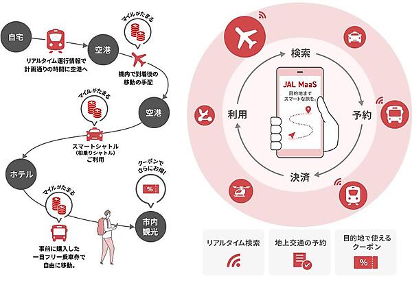 MaaSはMobility as a Serviceの略で、航空機、鉄道、バス、タクシーなど複数の交通機関や他の移動手段を最適に組み合わせ、検索、予約、決済を一括で行うサービスを意味する。JALはこれまでも交通事業者と連携して出発地と空港、空港と目的地つなぐ移動手段が手配できるサービスを提供してきたが、今回、よりシームレスなサービスとしてJAL MaaSの展開を開始した。