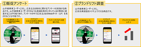 Jビーコンと連携するpinableがトリマユーザーの山手線への乗車を検知し、まど上チャンネルの動画広告に触れたと想定されるユーザーにアンケートを配信する。広告放映期間と同期間に乗車を検知された端末をモニターとし、ブランド認知、利用意向、広告認知について調べ、広告効果を測定する。調査レポートは広告放映終了後、12営業日前後で提出。1週間単位の放映で効果測定が可能になる。