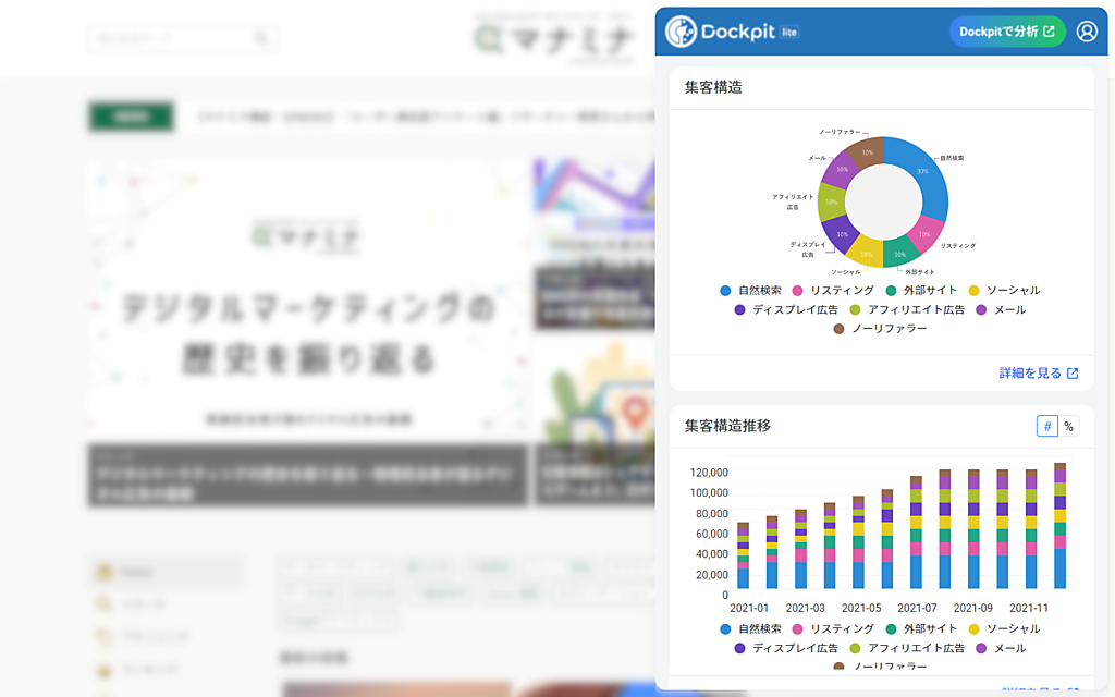 Dockpit liteは、「Google Chrome」のブラウザ拡張機能に追加してサイトを閲覧しながら同じ画面上で情報収集・データ分析する。Dockpitの本体画面を経ずに現在閲覧しているサイトの流入数や集客構造をワンクリックで確認でき、打ち合わせ中に急に必要になった情報収集やデータ分析でも即座に対応できる。複数サイトを比較したり、より深堀りしたりする場合はDockpitの本機能に遷移して詳細分析が可能。