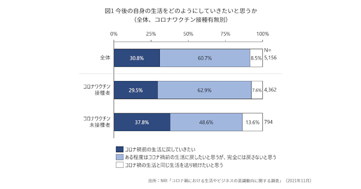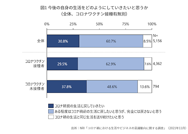 まず「今後、自身の生活をどのようにしていきたいか」と聞くと、「コロナ禍前の生活に戻していきたい」30.8%、「ある程度はコロナ禍前の生活に戻したいと思うが、完全には戻さないと思う」60.7%、「コロナ禍の生活を送り続けたい」8.5%と、生活変化が定着しつつあるようだ。コロナワクチン未接種の人においても、「ある程度はコロナ禍前の生活に戻したいと思うが、完全には戻さないと思う」は48.6%とやや数値が下がるが最多となっている。