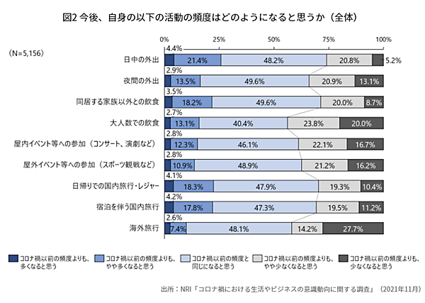 野村総合研究所(NRI)は、「コロナ禍における生活やビジネスの意識動向に関する調査」の結果を発表した。アフターコロナの行動に対する考え方などについて、全国20~79歳の男女合計5,156人から回答を得ている。