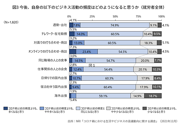 「自身の通勤やテレワーク、会食、出張など、ビジネスにともなう諸活動の頻度の見通し」を就労中の1,820人に聞くと、「コロナ禍以前の頻度よりも多くなる・やや多くなると思う」は、「オンラインでの打ち合わせ・商談」30.7%が特に多く、それに「テレワーク・在宅勤務」19.5%が続くなど、アフターコロナでも現状のスタイルが続きそうだ。