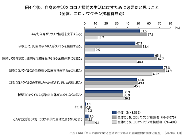 最後に「今後、自身の生活をコロナ禍前に戻すために必要だと思うこと」を聞くと、「新型コロナウイルスの治療薬や治療方法があきらかになること」73.3%、「感染しても確実に、適切な治療を受けられる医療体制になること」65.1%が上位となっている。