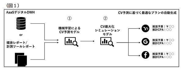 Digital AaaSは、デジタル広告を統合管理して効果的・効率的に運用する次世代型広告ソリューション。①予算や出稿時期などの条件と媒体ごとのCVを高精度に予測②CV予測に基づいて与えられた条件下でCVを最大化する出稿プランを作成――の2つの機能を新たに追加した。日別のキャンペーン実施フラグ▽テレビの日別出稿実績データ▽自然検索数推移など日別で用意可能なデータ――を予測に考慮する説明変数にできる。