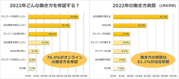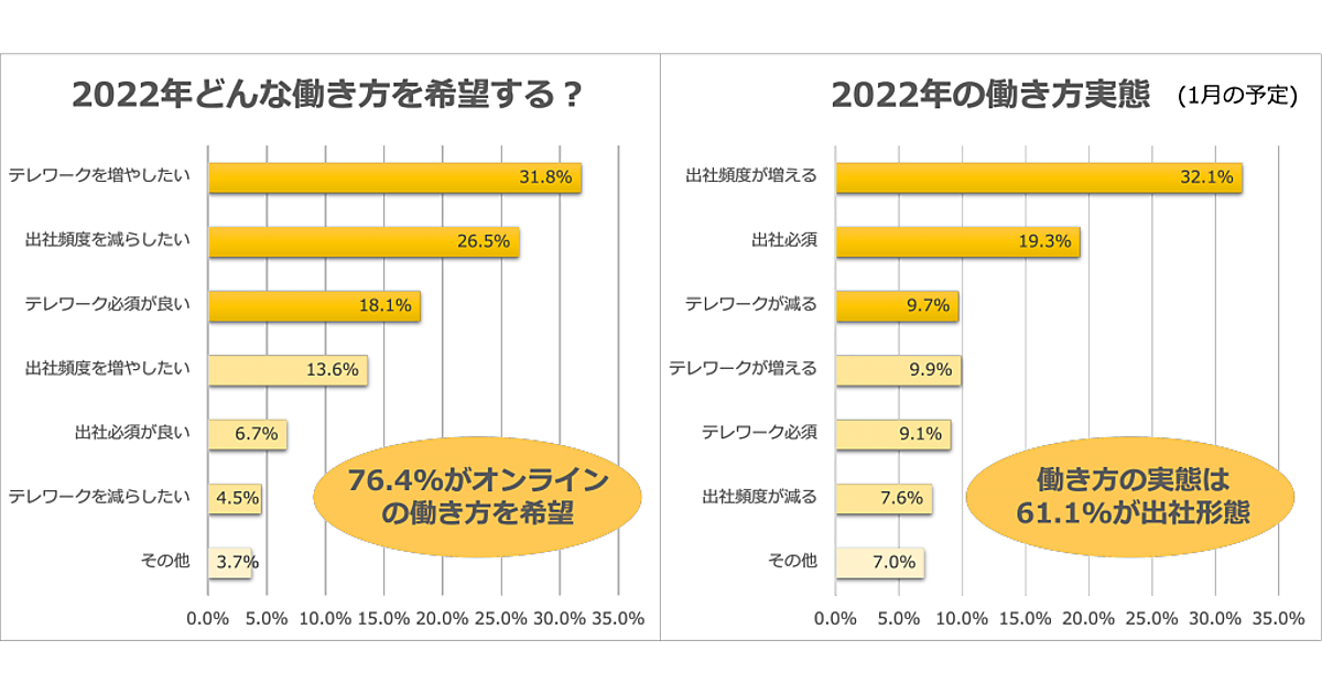 「2022年はどんな働き方を希望するか」を聞くと、「テレワークを増やしたい」31.8%、「出社頻度を減らしたい」26.5%、「テレワーク必須が良い」18.1%で、7割超がオンラインを希望する一方、「2022年の働き方実態(2022年1月の予定)」では、「出社頻度が増える」32.1%、「出社必須」19.3%が上位で、「テレワークが減る」9.7%も加えると、全体の6割ほどが出社となっていた。