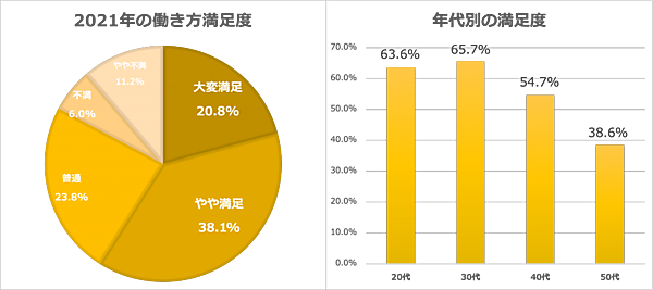 最後に「2021年の働き方満足度」を聞くと、「大変満足」20.8%、「やや満足」38.1%で、全体の6割近くが満足を見せたが、年代別では30代が最多の65.7%で、以降年代が上がるほど満足度は低下していた。