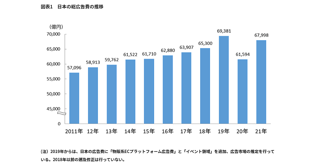- 2020年の日本の総広告費、9年ぶりのマイナス成長。前年を大きく下回るhttps://webtan.impress.co.jp/n/2021/02/26/39258