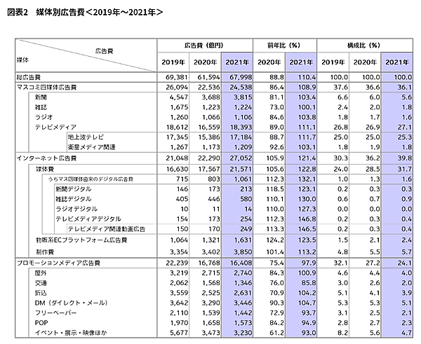 「4マス広告費」「インターネット広告費」「それ以外(プロモーションメディア広告費)」の区分で見ると、4マス広告費は以前の低迷期より回復傾向を見せており、2021年は新聞・雑誌・テレビ・ラジオすべて前年超えで2兆4,538億円(前年比108.9%)となった。インターネット広告費は2桁成長を維持し、2兆7,052億円(前年比121.4%)。それ以外(プロモーションメディア広告費)も回復を見せ、若干前年を下回るが1兆6,408億円(前年比97.9%)を維持した。