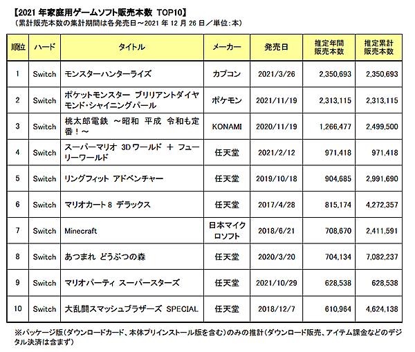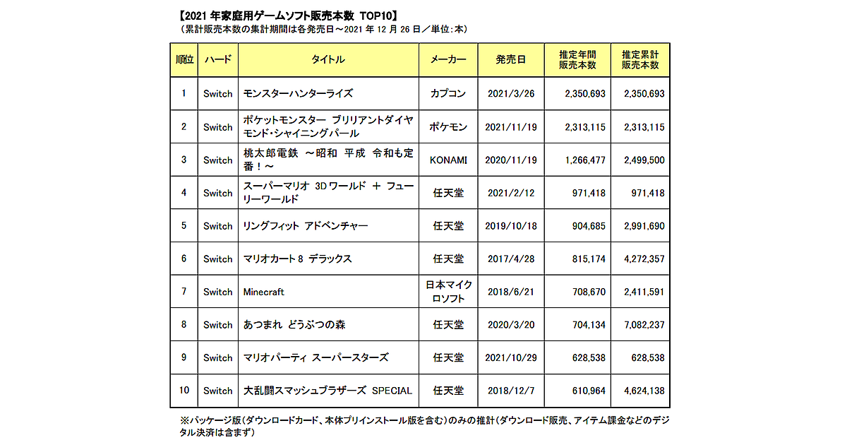 年間ソフトランキングの首位は、『モンスターハンターライズ』(カプコン/2021年3月26日発売/Switch)で、パッケージ版だけで235.1万本を販売した。2位には『ポケットモンスター ブリリアントダイヤモンド・シャイニングパール』(ポケモン/2021年11月19日発売/Switch)231.3万本がランクイン。3位は『桃太郎電鉄 ~昭和 平成 令和も定番!~』(KONAMI/2020年11月19日発売/Switch)126.6万本がランクインした。