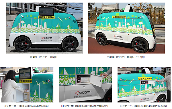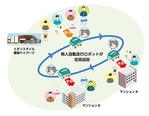 1台のロボットが商業施設と2棟のマンションの間を巡回し、重量物やかさばる荷物の持ち帰りを支援する。搭載する共用ロッカーには大中小のサイズがあり、タッチパネル操作で開閉する。ロボットの活用は、人手不足が深刻化するラストワンマイル配送の課題解決や、配送効率化の実現に期待されている。ロボットは、ミニカー(長さ2.5m×幅1.3m×高さ2.0m以下)に準じた大きさで、最高速度は時速15km。