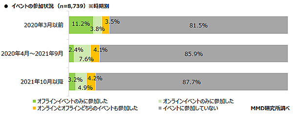 まず「イベントへの参加状況」について、コロナ禍前の2020年3月以前、コロナ禍の最中の2020年4月~2021年9月、withコロナが定着した2021年10月以降の3期間で全体に聞くと、2020年3月以前は「オフラインイベントのみに参加した」が11.2%、「オンラインイベントのみに参加した」3.8%だったのに対し、2020年4月~2021年9月は「オフラインイベントのみに参加した」2.4%、「オンラインイベントのみに参加した」7.6%と逆転。2021年10月以降もオンライン優勢ながら「オフラインイベントのみに参加した」3.2%、「オンラインイベントのみに参加した」4.9%と数字が近づいた。なお「両タイプのイベントに参加」は4%前後で一定している。