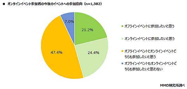 なおオンラインイベント参加者1,382人に「今後のイベントへの参加意向」を聞くと、「オフラインイベントに参加したいと思う」21.2%、「オンラインイベントに参加したいと思う」24.4%、「オフラインイベントとオンラインイベントどちらも参加したいと思う」47.4%で、オフラインも根強く望まれていることがわかる。
