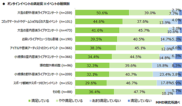 参加したオンラインイベントを覚えている1,335人に「オンラインイベントの満足度」を聞いたところ、「満足している」と「やや満足している」を合わせて満足しているがもっとも多いのは大型の野外音楽ライブやコンサート(n=259)で89.6%、次いで大型の室内音楽ライブやコンサート(n=473)が87.3%、アイドルや音楽アーティストのファンイベント(n=366)が83.4%となった。どの種類のイベントでも、「満足している」「やや満足している」の合計が7割以上を超えており、オンラインでもほとんどの参加者が満足していることが明らかとなった。