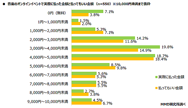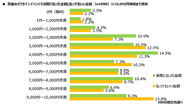 「音楽のオフラインイベントで実際に払った金額と払ってもいい金額」を聞くと、実際に払った金額は「4,000円~5,000円未満」14.5%が最多で、平均は6,508円、払ってもいい金額は「9,000円~10,000円未満」13.8%が最多で、平均7,007円だった。