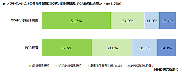 最後にあらためて全体に「オフラインイベントに参加する際にワクチン接種証明書、PCR検査は必要か」を聞くと、ワクチン接種証明書は「必要だと思う」51.7%、「やや必要だと思う」24.9%で、計76.6%が必要だと考えている。PCR検査も「必要だと思う」37.6%、「やや必要だと思う」30.0%で、高い数字を示している。今後は身分証明書とともにワクチン接種証明書が、イベントへの携行必須となりそうだ。